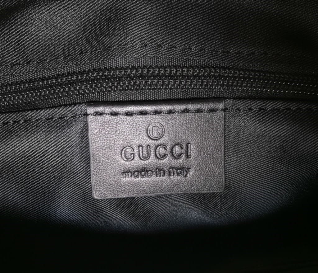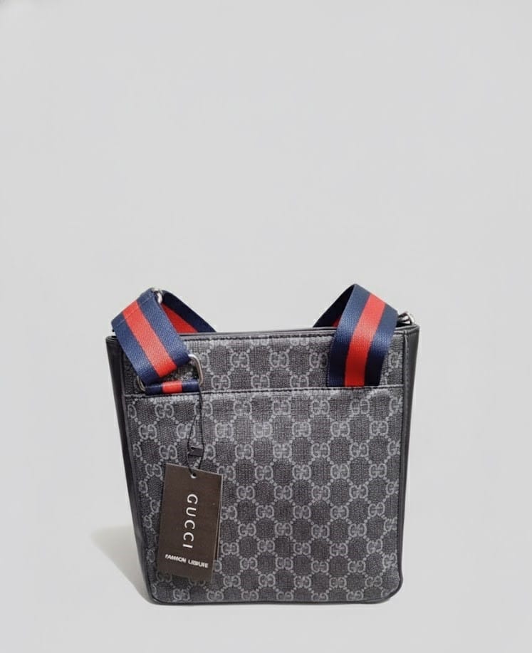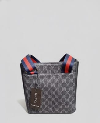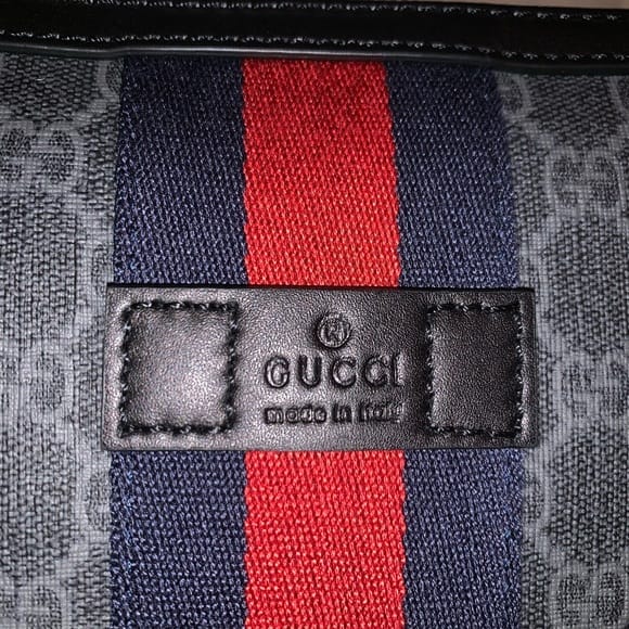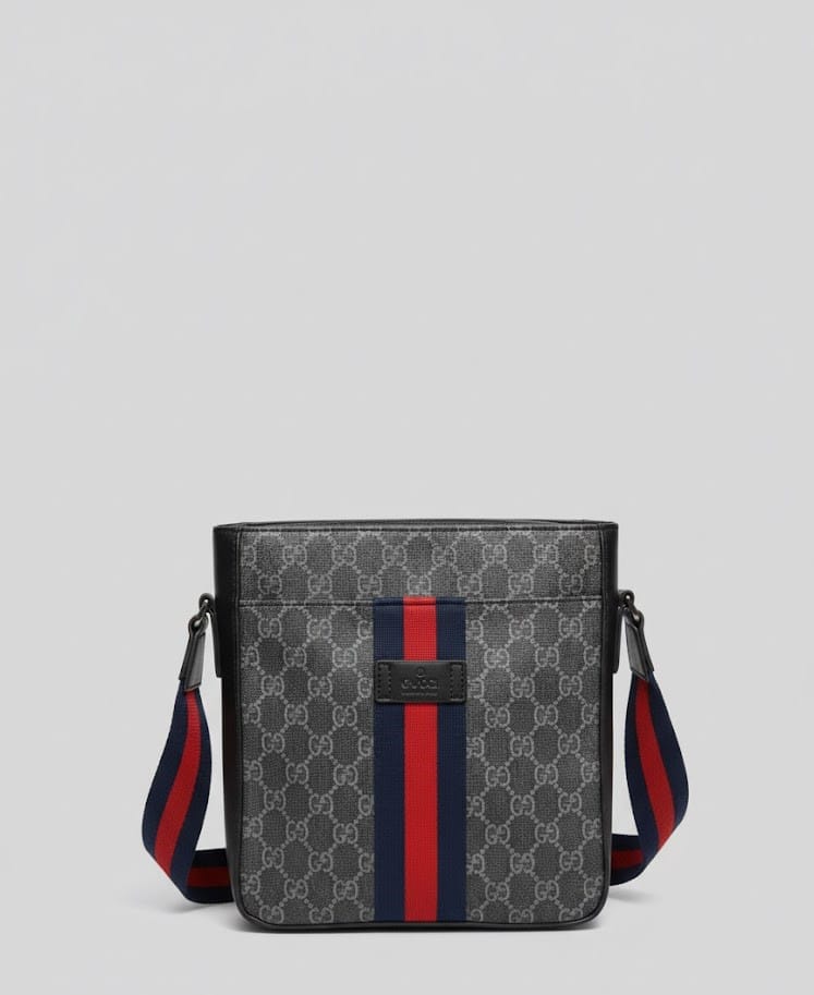 This is a Gucci GG Supreme canvas messenger bag in black/grey with a blue and red Web strap.