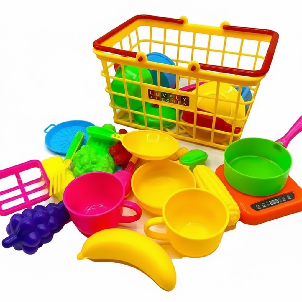 Includes toy vegetables, fruits, utensils, stove top items, and more—everything your little chef needs.