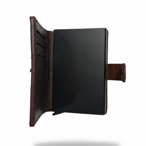 SAVEFOX Luxury RFID-Blocking Aluminum Card Holder Wallet with Genuine Leather Cover – Pop-Up Card Ejector & Snap Closure (Vintage Brown).